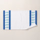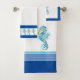 Este grupo de toalha de banho é mostrado em uma mistura do litoral de cores. A toalha de banho, as listras inferiores corajosas nos azuis marinhos e no azul do Cornflower com mais finamente as listras do branco e do azul e de azul-céu do Cornflower. Os cavalos marinhos do divertimento cores azuis/Verde-Multi são manchados dentro da área center da toalha. A toalha de mão tem os mesmos cavalos marinhos em extremidades com as listras dos azuis marinhos e do azul do Cornflower com beira do cavalo marinho e uma listra de azul-céu fina acima dos azuis marinhos. O pano da lavagem é limitado toda a maneira ao redor por azuis marinhos com uma listra fina interna dos azul-céu e um único cavalo marinho maior no centro. Cor coordenada para do "a esteira de banho beira-mar".