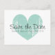 O coração azul turquesa salve os cartões postais para o casamento. Vintage, simbolo de amor com texto elegante para noiva e noiva, além de data. Design de ilustração romântica fofa personalizada com sua mensagem para convidados. A cor de fundo personalizável é branca. Impressão de música russa para a festa de casamento clássico.