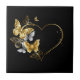 Dourada estrutura em forma de coração, decorada com ouro, joias e borboletas brancas sobre fundo preto.