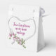 Flores cor-de-rosa com buquê verde de maria no coração de fita branca de cetim e arco em fundo branco suave. Nomes, data de casamento e citação de amor são editáveis.
