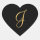 J inicial, de cor Dourada, sobre o adesivo em forma de coração com monograma preto.