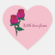 A design baseia-se numa pintura digital que mostra um par de rosas vermelhas com um caule verde e uma folha verde. Baseia-se num fundo de rosa claro, juntamente com as palavras "com amor de". Você pode facilmente submeter suas próprias palavras e mudar a cor do fundo.