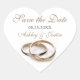 Uma maneira simples e hetero de enviar um lembrete de data para salvar. Dois anéis de casamento de ouro estão entrelaçados nesse adesivo, exceto o adesivo de data. Basta adicionar a data e os nomes do casamento. Utilizar como invólucro ou embalagem selada ou como favores numa festa de noivado. Disponível com produtos correspondentes.