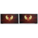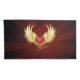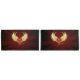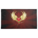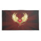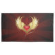 Coração vermelho brilhante de um anjo com asas ouros brilhando no fundo vermelho-radiante escuro decorado com um padrão.