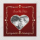 Anúncio personalizado de salvar a data com corações dourados em fundo vermelho escuro. Adicione sua foto e personalize com suas próprias informações ou clique em "Personalizar" se precisar editar ainda mais o layout.