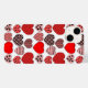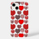 Esta capa de telefone tem um design de repetir corações com diferentes dentro gráficos em um campo de branco.