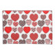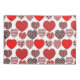 Este travesseiro tem uma design de repetição de corações com diferentes dentro gráficos num campo de branco.