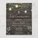 Tipografia de script rosa. Fundo de textura falsa de madeira, luzes de jarro, design de campo rústico. Primeiros convites orçamentais para comemoração da Comunidade. Você pode adicionar fotos à parte traseira ou texto adicional, se necessário.