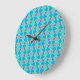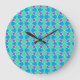 Um relógio de parede redondo, com um padrão tradicional islâmico em azul-turquesa, verde-claro, roxo e branco. Parte da coleção "Islâmica" Posh & Painterly