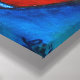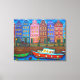 Uma vibrante e animada cena noturna estilizada das casas coloridas e estreitas de Amsterdã, ao longo dos canais, em uma tela impressa pela artista popular Lisa Lorenz