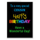 Um cartão de aniversário colorido para um primo, com rotulação brilhantemente colorida em um fundo preto, na palavra "feliz" no amarelo e na palavra "aniversário" em cores do arco-íris.