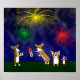 Feliz 4 de julho! Este incrível poster de arte Pembroke Welsh Corgi comemora o Dia da Independência da América com muitos fogos de artifício coloridos e nossos tradicionais desenhos animados. Um córgi pai está colocando uma combinação com um "Big Boom", enquanto seu filhote vermelho e branco tem suas patas sobre seus ouvidos, e seu pequeno cachorro bebê sável pula para cima e para baixo espreitando com entusiasmo. Mamãe Corgi está trazendo limonada para todos! Diversão 4 de julho de Pembroke Welsh Corgi poster.