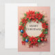 Coroa de Natal brilhante e alegre adornada com poinsétia vibrante, ornamentos cintilantes, flocos de neve e fitas em um fundo quente e suave simbolizando alegria e celebrações de Natal.