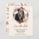 Um simples e elegante cartão de Salvar a Data de casamento com uma coroa floral chic e design de folha de ouro rosa que é fácil de personalizar com seus detalhes. O cartão tem um estilo moderno boho, caligrafia personalizável, fonte manuscrita e um convite de casamento com foto de coroa.