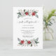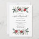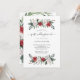 Este convite simples e elegante para brunch pós-casamento apresenta ramalhetes estilizados em aquarela, compostos por folhagens modernas e flores de Natal vermelhas e brancas sobre um fundo branco. O verso do convite apresenta uma coroa de Natal estilizada e combinando. Perfeito para uma recepção após o casamento ou almoço de recém-casados.