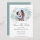 Nossa coleção botânica suave apresenta folhagens em tons de verde claro, azul-turquesa e dourado em aquarela suave, combinadas com molduras douradas e fundo azul-turquesa para uma coleção de casamento perfeitamente elegante. Você pode encontrar itens correspondentes para sua experiência completa de casamento, mas também artesanatos, presentes e alguns itens pessoais. Acreditamos que você vai gostar ao máximo, pois é uma coleção para todas as estações. Este cartão de "save the date" apresenta sua própria foto em uma grinalda de folhagem azul com todas as informações em letra elegante para você personalizar.