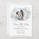 Nossa coleção botânica suave apresenta folhagem em tons de verde claro, azul-turquesa e dourado em aquarela suave, combinada com molduras douradas e fundo azul-turquesa para uma coleção de casamento perfeitamente elegante. Você pode encontrar itens correspondentes para sua experiência de casamento completa, mas também artesanatos, presentes e alguns itens pessoais. Acreditamos que você irá desfrutar ao máximo, pois é uma coleção para todas as estações. Este cartão de "salve a data" apresenta sua própria foto em uma coroa de folhagem azul com todas as informações em letra elegante para você personalizar.