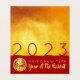 Design moderno com papel texturizado a ouro (imagem impressa) com grande 2023 em vermelho + pequeno papel redondo Tigre cortado com textos amarelos FELIZ ANO NOVO e Ano do Coelho sobre um fundo vermelho. cartões de visitas dobrados de design na tenda com dentro de fundo do ouro. Cartão de convite simples quadrado, cartão de saudação, cartão postal de feriado e muito mais... Perfeito para um eterno e moderno Ano Novo Chinês do Coelho 2023.