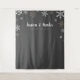 Pano de fundo perfeito para o seu casamento de inverno! Flocos de neve brancos e dourados em fundo cinza escuro com texto branco.
