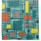 Um design geométrico de meio século de arte moderna, com linhas, quadrados e retângulos em turquesa, teal, laranja e amarelo.