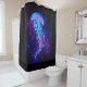 Água-viva grande, azul, desenhada artisticamente, brilhante, brilhante, com longos tentáculos sobre fundo preto com bioluminescência roxa. Água-viva luminosa.