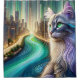 Este trabalho de arte espetacular apresenta um gato com características impressionantes e padrões de pele em tons de roxo e azul, olhando para fora de uma janela alta. Os olhos verdes vibrantes do gato destacam-se à medida que se aproxima da vibrante paisagem urbana abaixo. O fundo apresenta edifícios altos ao lado de uma paisagem aquática sinuosa que reflete a luz em várias formas de verde e azul. O contraste entre a elegância natural do gato e o ambiente urbano estilizado cria uma atmosfera cativante e serena.