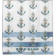 Esta imagem apresenta um nome de barco e ancora em um fundo listrado azul claro e branco.