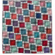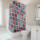 Esta cortina de chá tem um design de quadrados de arte deco feito de ângulos sobrepostos em tons retrorados de azul e rosa.