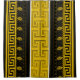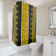 Este trabalho de arte de cortina de chá consiste em formas clássicas de linha chave grega, estreitamente relacionadas, sobre um fundo profundo de canvas preto e amarelo-mostarda, com uma camada vertical de linha branca e duas finas que produz uma interação impressionante com o contraste.