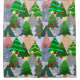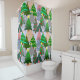 Esta cortina de chá tem um design de árvores de Natal em vários tons de verde, rosa, prata e ouro com diferentes decorações.