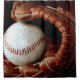 Esta cortina de chá tem uma bola de basebol e uma luva fotografada nela.