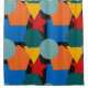Esta cortina de chá tem um design Bauhaus de formas aleatórias em azul, lacre, amarelo, vermelho e laranja.