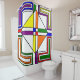 Esta cortina de chá tem um design Bauhaus de linhas, triângulos, diamantes e quadrados fazer um olhar colorido em cores primárias e secundárias.