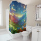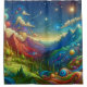 Uma ilustração muito colorida e mística de montanhas, árvores e céu estrelado.
