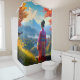 Uma composição surrealista de uma linda mulher asiática olhando para fora e lago cercado por montanhas.