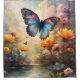 Uma borboleta grande, azul e vermelha veleja entre as flores que enfileiram um riacho num dia nublado nesta cortina de chá impressionante.