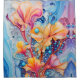 Uma vibrante explosão de flores psicodélicas, uma flor azul púrpura púrpura púrpura, rosa, no estilo da abstração biomórfica, ciano claro e amarelo, marmorizado, linhas fluidas e curvas,