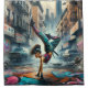A design mostra uma cena animada em que uma dançarina de break toca em cheio balançando na rua. O personagem principal, o dançarino de pausa, está no meio de um poderoso suporte de mão.