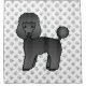 A ilustração original do desenho de Destei de um cão da raça Toy Poodle, casaco preto e bonito. O fundo tem um padrão de pegadas de cinza.