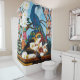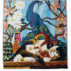 O gato Calico brincando com um dragão chinês vermelho em frente a uma janela de vidro colorido de pavão.
