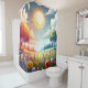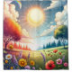 Um campo de relva sonhador com flores silvestres, árvores, nuvens peludas, o sol e a lua.