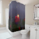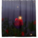 Ao anoitecer, os vagalumes flutuam e brilham sobre um jardim de rosa cheio de rosas vermelhas vibrantes.