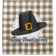 Chapéu de peregrino preto sobre um padrão de xadrez de búfalo branco marrom com a legenda "Feliz Ação de Graças".