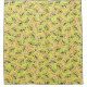 Patterned design with pink flowers and dark green leaves scattered on a bright yellow background. The floral motif is cheerful and lively.
