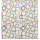Esta cortina de chá tem um design de Boho de círculos sobrepostos em tons retrorados de verde, castanho, azul e cinzas.