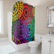 Esta cortina de chá tem um design de História Negra de grandes círculos formados a partir de formas de chuva e círculos em vermelho, amarelo, roxo, verde e turquesa.
