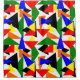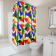 Esta cortina de chá tem um design de Bauhaus de uma colagem de triângulos em vermelho, amarelo, laranja, azul e verde.