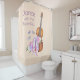 Uma cortina chá com um design feminino macio. Ilustrada com uma imagem de aquarela de um violino de madeira, alguns balés cor-de-rosa descansando contra ele e decorados com flores e borboletas. Texto diz: Dance com as Borboletas. Colocado sobre um fundo cor-de-rosa cor de pêssego.