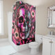 Esta cortina de chá tem um design de crânio rosa nela.