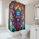 Esta cortina de chá tem um design de crânio de vidro colorido.